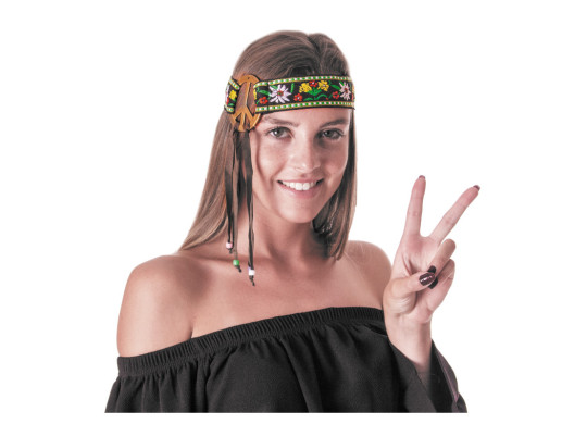Bandeau Peace and Love, léger et confortable. Parfait pour compléter un déguisement hippie, un look rétro ou ajouter une touche amusante à une tenue de fête, carnaval ou festival.