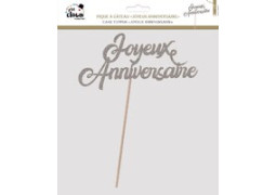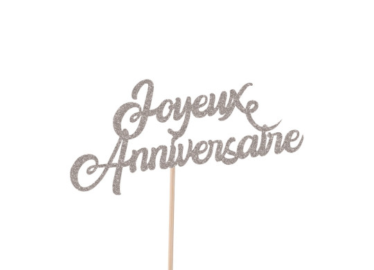 Pic à gâteau “Joyeux Anniversaire” pailleté argent, idéal pour décorer vos gâteaux de fête.
