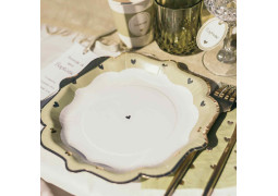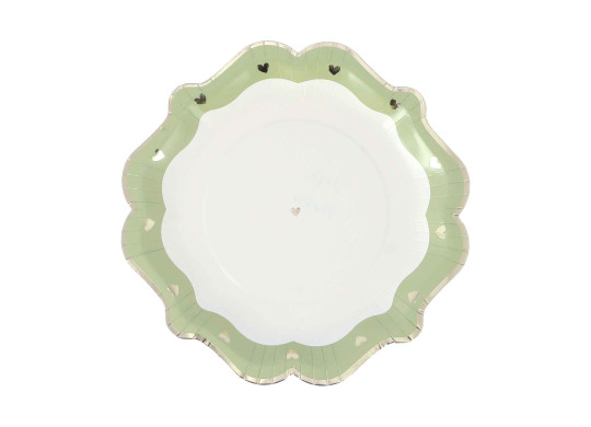 Lot de 8 assiettes baptême “Petits Cœurs” en carton blanc, vert de gris et or, diamètre 23 cm.