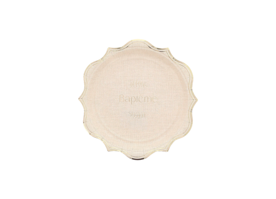 Lot de 8 assiettes petites/moyennes (PM) baptême “effet lin”, parfaites pour compléter une décoration de table élégante et naturelle lors d’une cérémonie.