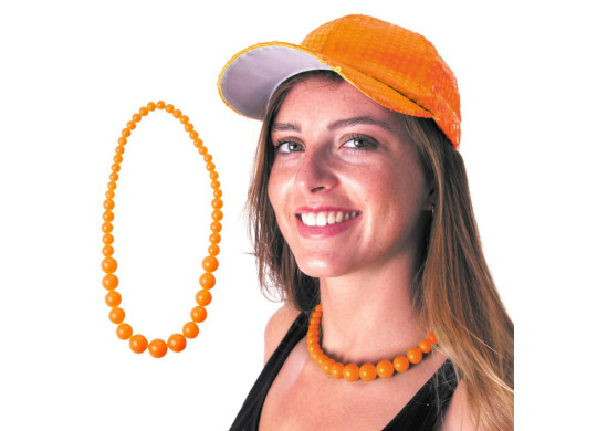 Collier composé de perles néon orange, léger et confortable. Parfait pour compléter un déguisement rétro, un look années 80 ou ajouter une touche flashy à une tenue de fête, carnaval ou festival.