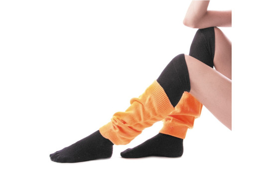 Lot de 2 guêtres tricot orange fluo, parfaites pour compléter un déguisement ou apporter une touche colorée à vos fêtes et animations.