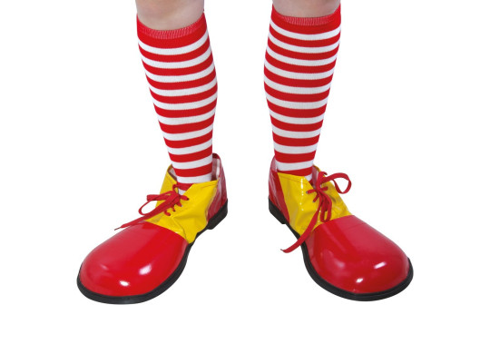 Chaussettes de clown rayées blanc et rouge, accessoire parfait pour compléter un costume coloré et amusant lors d’un carnaval ou d’une fête déguisée.