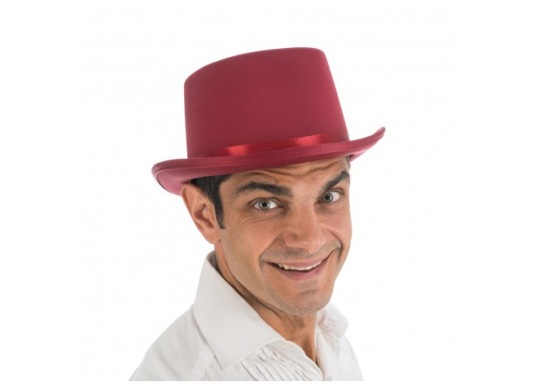 Chapeau haut de forme bordeaux en satin, hauteur 12 cm. Parfait pour compléter un costume élégant ou une tenue de cérémonie, soirée déguisée ou événement à thème. Léger et confortable à porter.