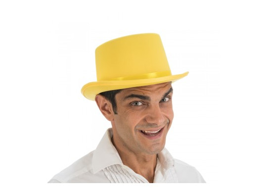 Chapeau haut de forme jaune en satin, hauteur 12 cm. Parfait pour compléter un costume élégant ou une tenue de cérémonie, soirée déguisée ou événement à thème. Léger et confortable à porter.