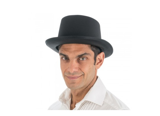 Chapeau haut de forme noir en satin, hauteur 12 cm. Parfait pour compléter un costume élégant ou une tenue de cérémonie, soirée déguisée ou événement à thème. Léger et confortable à porter.