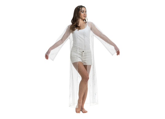 Veste longue blanche transparente parfaite pour les festivals. Légère, fluide et ornée de paillettes pour un look brillant et tendance. Se porte facilement sur une tenue d’été. Taille unique.