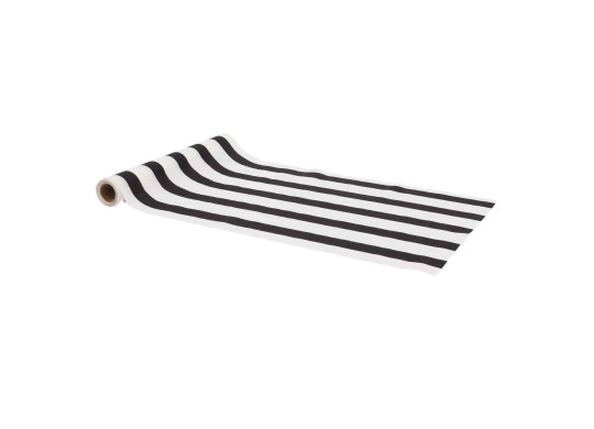 Chemin de table en tissu rayé noir et blanc de 28 cm x 5 m. Idéal pour une décoration de mariage, anniversaire ou fête élégante sur le thème noir et blanc.