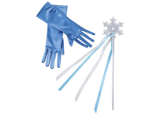 Set Reine des Glaces comprenant baguette et gants, parfait pour compléter un costume de princesse ou de personnage hivernal lors d’un anniversaire ou carnaval.