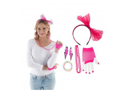Kit années 80 fluo rose ou vert avec accessoires complets, idéal pour une soirée à thème rétro et colorée.