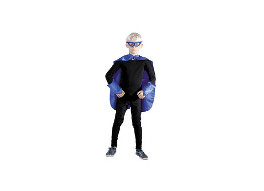Set de super-héros bleu pour enfant, comprenant une cape légère et fluide, un masque assorti et une paire de manchettes. Idéal pour stimuler l’imagination et se transformer en héros lors d’un anniversaire, d’un carnaval, d’une fête déguisée ou pour jouer à la maison.