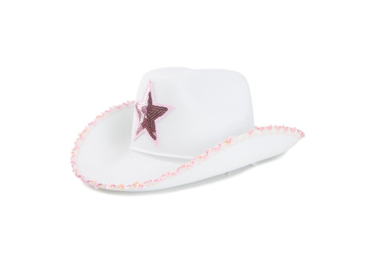 Chapeau cowgirl blanc décoré du logo Pink Star, léger et confortable. Idéal pour compléter un déguisement western, un look de fête à thème ou apporter une touche originale à une tenue de carnaval ou festival. Taille unique.