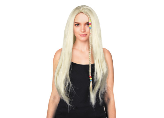 Perruque hippie femme blonde raide, idéale pour compléter un déguisement années 60–70 ou une tenue à thème.