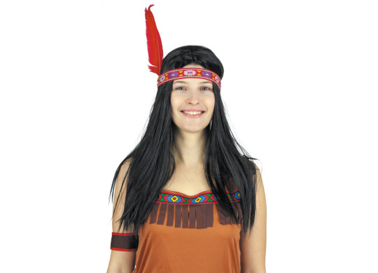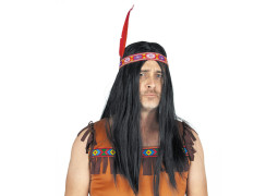 Perruque noire raide, mixte, style Indien/Indienne avec headband et plume rouge, idéale pour compléter un déguisement ethnique ou une tenue à thème.