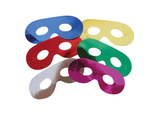 Masques en carton “Lou” assortis (6 couleurs : bleu, rouge, or, argent, vert, rose), idéaux pour compléter des déguisements ou animer vos fêtes.