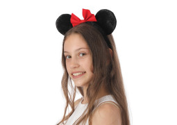 Serre-tête avec oreilles de souris et nœud rouge, idéal pour compléter un déguisement ou une tenue festive.