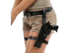 > Voir la description complèteHolster double cuisse conçu pour porter des accessoires factices comme des pistolets ou revolvers.