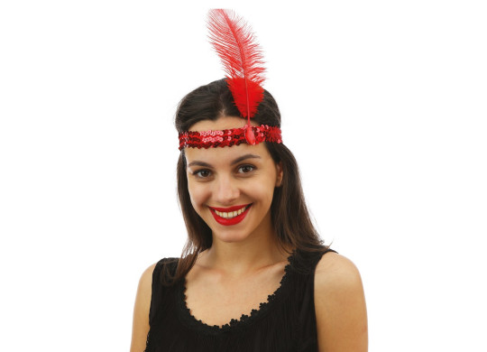 Bandeau Charleston rouge avec sequins et plumes, idéal pour compléter un déguisement années 20 ou une tenue élégante.