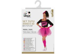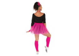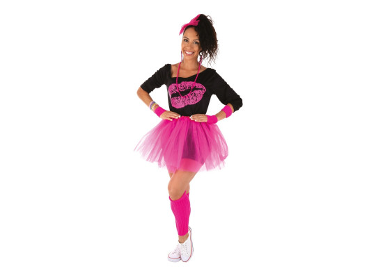 > Voir la description complèteSet de déguisement adulte style années 80 de couleur rose comprenant : un t-shirt, un collier, des boucles d’oreilles, un serre-tête, un tutu, des guêtres et des gants. Parfait pour un look fun et coloré. Idéal pour soirées à thème, carnaval ou fêtes déguisées.