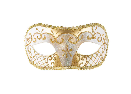 Lou vénitien blanc et or, demi‑masque élégant pour compléter un déguisement ou une tenue festive.