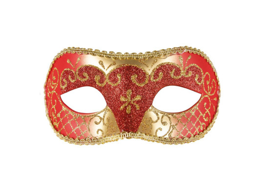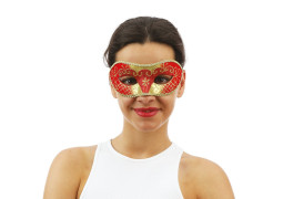 Lou vénitien rouge et or, demi‑masque élégant pour compléter un déguisement ou une tenue festive.