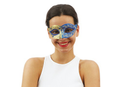 > Voir la description complèteLou décoratif de style vénitien aux couleurs bleu et or, léger et confortable à porter. Ce demi‑masque couvre la partie supérieure du visage et est idéal pour soirées costumées, carnavals, bals masqués ou fêtes à thème. Apporte une touche raffinée, élégante et festive à votre tenue, parfait pour créer un look mystérieux et chic.