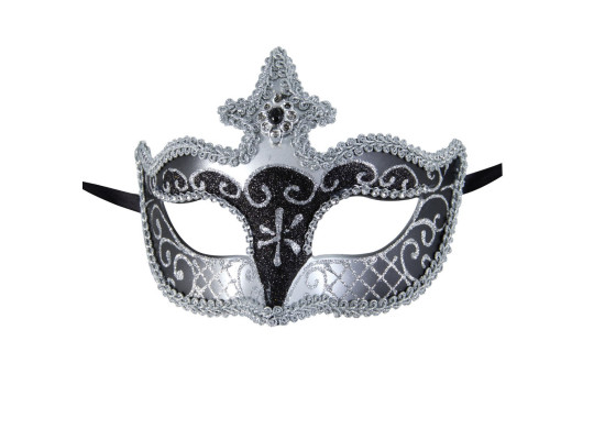 Lou vénitien noir et argent en plastique, demi‑masque festif pour compléter un déguisement ou une tenue élégante.