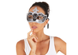 > Voir la description complèteLou en plastique noir et argent, léger et confortable à porter. Ce demi‑masque couvre la partie supérieure du visage et est parfait pour soirées costumées, carnavals, bals masqués ou fêtes à thème. Apporte une touche élégante et raffinée à votre tenue tout en restant facile à porter et durable.