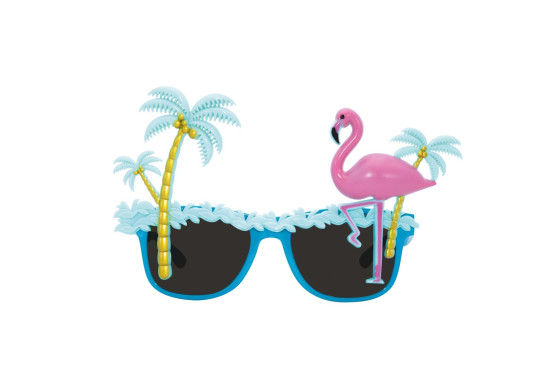 Lunettes tropicales avec motifs palmier et flamant rose, parfaites pour compléter un look estival et festif.