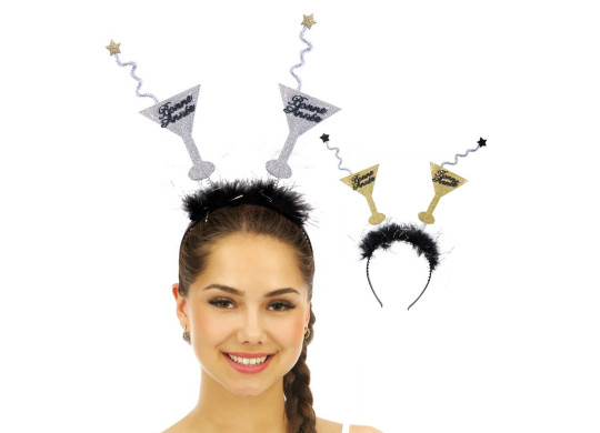 Serre-tête ressort “Bonne Année” avec mini-coupe de Martini, parfait pour compléter un look festif du Nouvel An.
