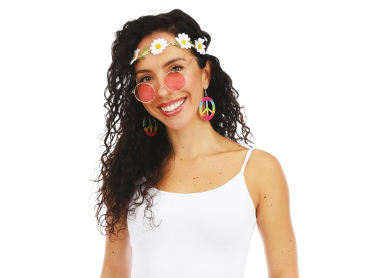 Set adulte hippie comprenant bandeau, boucles d’oreilles et lunettes, parfait pour compléter un déguisement Peace & Love.