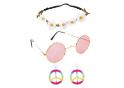 > Voir la description complèteSet hippie pour adulte composé d’un bandeau, de boucles d’oreilles et de lunettes. Idéal pour soirées à thème années 60/70, festivals, carnavals ou fêtes costumées, il permet de recréer un look Peace & Love coloré et rétro. Accessoires légers et faciles à porter pour compléter rapidement un déguisement hippie.