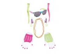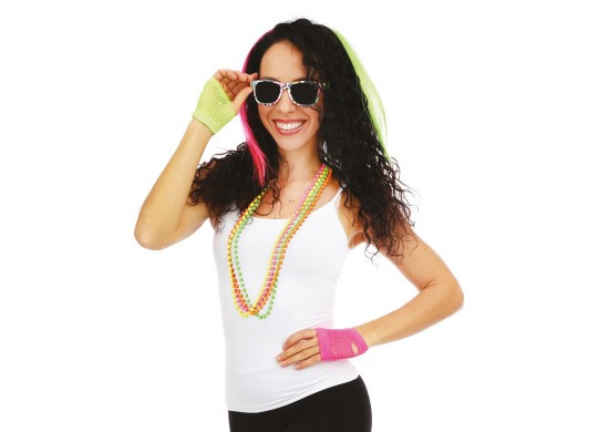 Set complet années 80 comprenant mèches, boucles d’oreilles, lunettes, mitaines et colliers, parfait pour compléter un déguisement rétro et coloré.