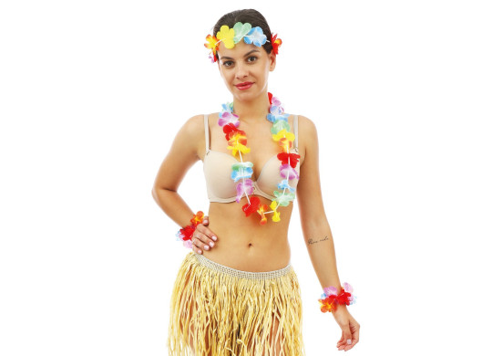 Set hawaïen multicolore comprenant collier, bandeau et bracelets, parfait pour compléter un look tropical et festif.