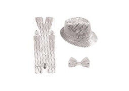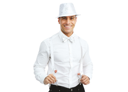 Set adulte disco sequins argent comprenant chapeau, bretelles et nœud papillon, parfait pour une soirée à thème années 70 ou une fête disco.