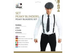 Set adulte style Peaky Blinders comprenant béret, cravate et bretelles, idéal pour un look rétro lors d’une soirée à thème ou d’un carnaval.