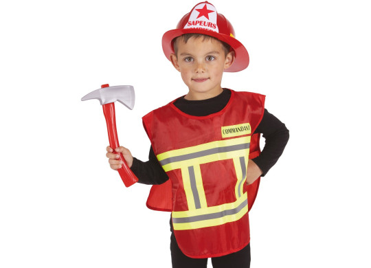 Set enfant pompier comprenant casque, gilet, marteau et extincteur, parfait pour compléter un déguisement lors d’un anniversaire ou carnaval.