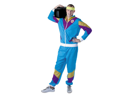 Costume jogging bleu style années 80. Léger et confortable, il est parfait pour les soirées à thème rétro, les carnavals ou les fêtes déguisées. Taille M-L