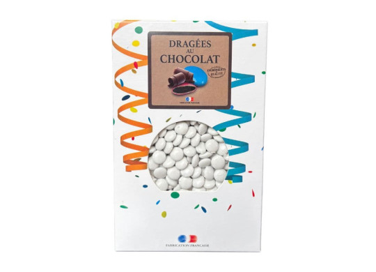 Boîte de 500 g de dragées confettis brillants au chocolat, idéales pour offrir un souvenir gourmand à vos invités.