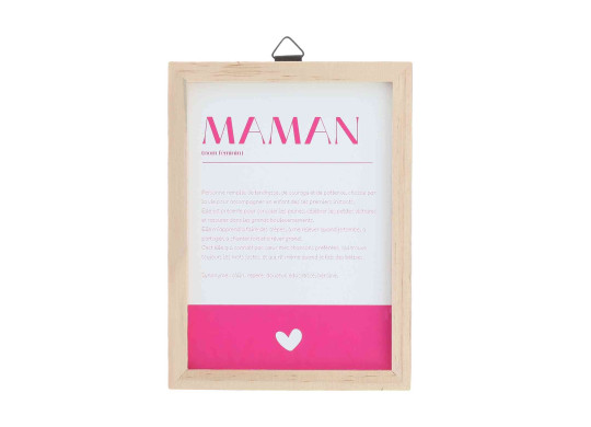 > Voir la description complèteCe cadre décoratif présente la définition de “Maman” sur un fond framboise élégant, apportant une touche personnelle et raffinée à votre cadeau. Idéal pour la fête des mères, un anniversaire ou toute occasion spéciale, il se pose facilement sur un bureau, une étagère ou un mur. Un présent esthétique et chargé de sens pour témoigner de votre affection.