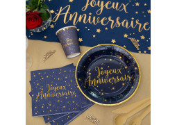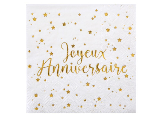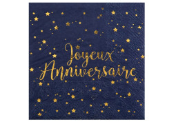 Paquet de 20 serviettes cocktail 25 x 25 cm « Joyeux Anniversaire » avec inscription métallisée or, disponibles en olive, doré, rose gold ou bleu.