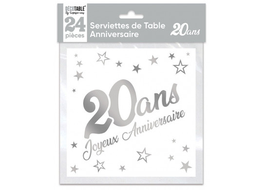 Paquet de 24 serviettes en papier blanc "20 ans" 33x33cm.