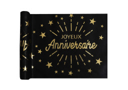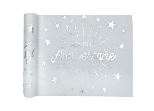 Chemin de table « Joyeux Anniversaire » étincelant 30 cm x 5 m, disponible en argent, or ou rose gold.