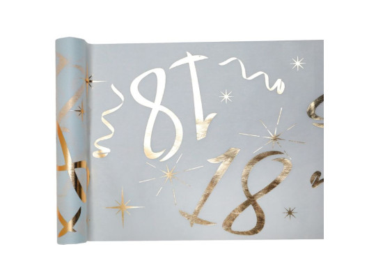 Chemin de table anniversaire métallisé or 30 cm x 5 m, fond blanc avec chiffres dorés, disponible de 18 à 80 ans.