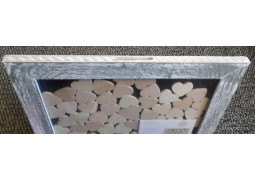 Cadre en bois naturel mesurant 30x40cm avec paroi vitré et 53 coeurs en bois.