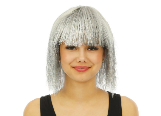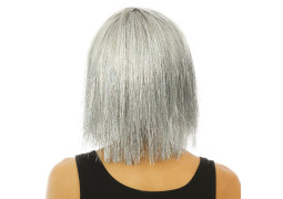 Perruque disco luxe argent, idéale pour compléter une tenue de fête ou un déguisement à thème.